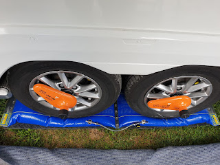 But that wasn't the main issue. Until now we've been pretty lucky with our pitches, in that the van has not needed levelling side to side. Until now. I hadn't fancied bouncing the twin wheeler over a set of ramps. Lock n Levels are eye wateringly expensive, but a few weeks back I picked one up on Facebook Market for a bargain £40.